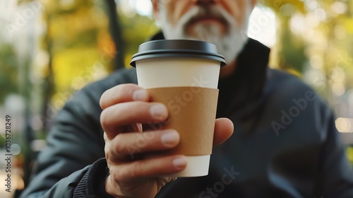 Middle-aged man with slight tremor holding cup of coffee on park bench, symbolizing struggle with Parkinson's disease, calm natural setting.