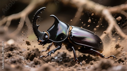 Mighty Rhinoceros Beetle with Iridescent Armor Forging Through the Earth