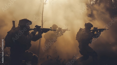 Military soldiers strategically advancing through a forest shrouded in dust and sunlight, emphasizing tactics, coordination, and determination in their movements.