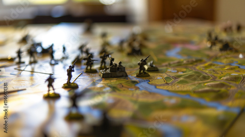 Military Strategy Map with Miniature Soldiers and Terrain Models on Wooden Table, Detailed Planning Scene