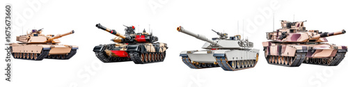 Military Tanks Displayed in a Row Showing Different Models and Camouflage Patterns in a Clear Background