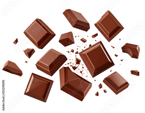 Milk chocolate pieces explode in mid-air, showcasing rich, brown hues and textures
