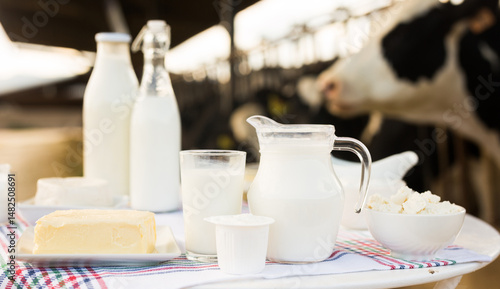 Milk, cottage cheese, cream, cheese on table against background of cows