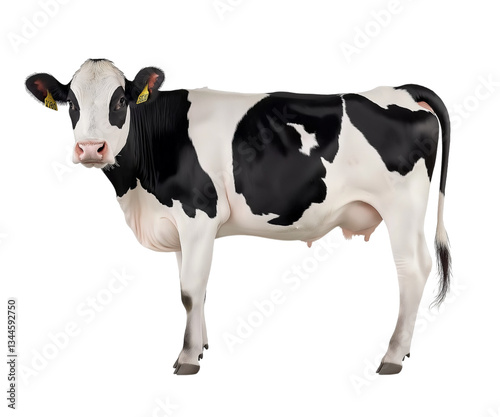 Milk Dairy cow standing, side view, looking at the camera, on PNG format and transparent background