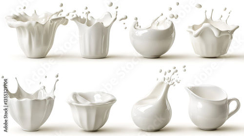 Milk Splashing in Elegant White Bowls and Creamer Delightful Dairy Scene