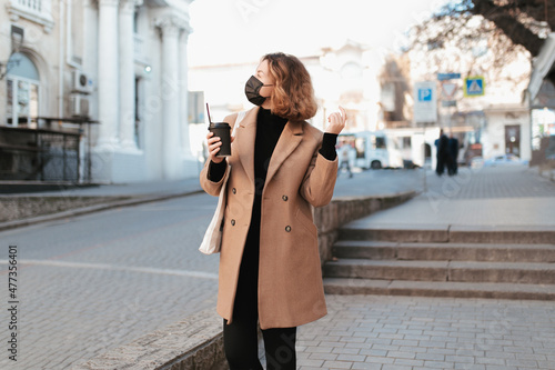 Millennial woman in mask with coffee to go