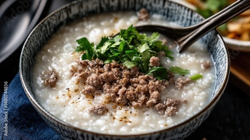 Minced pork congee with white pepper sprinkled lightly on top and spoon placed gently inside