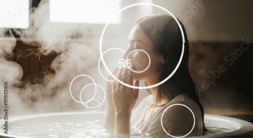 Mindful Meditation in Steamy Hot Bath with Abstract Digital Rings and Number