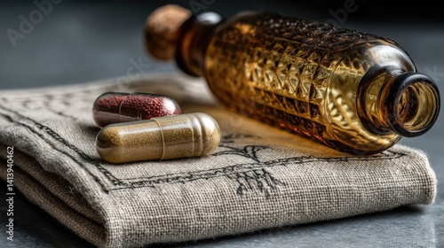 Mindful nutrition with reishi and ashwagandha capsules on a linen napkin