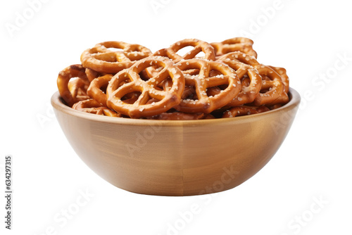 Mini pretzel on wooden bowl isolated on transparent background. Generative Ai