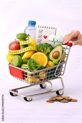 Mini Shopping Cart Full of Healthy Food and Fitness Items on White Background, Wellness Concept