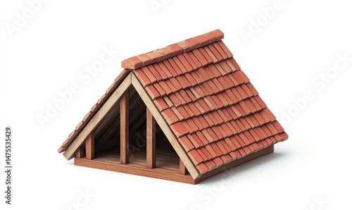 Miniature A-frame cottage with terracotta roof. Wooden structure and detailed tiles