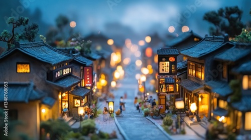 Miniature Asian village street at twilight, people walking, illuminated buildings