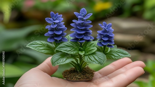 Miniature blue flowers in hand photo