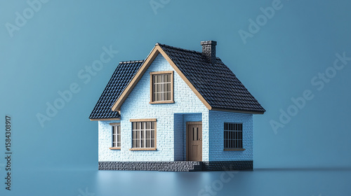 Miniature house model with blue brick walls and dark roof on blue background, showing detailed windows and chimney in calm setting