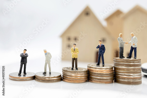 Miniature people: Businessmen shaking hands on coins stack with house and car. Concept of investment in housing and vehicles.