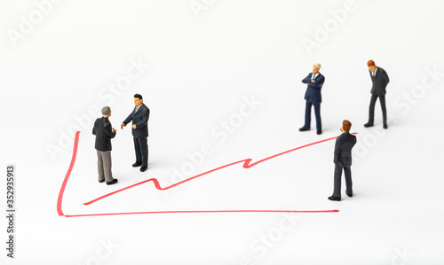 Miniature people on paper with painted financial chart.
