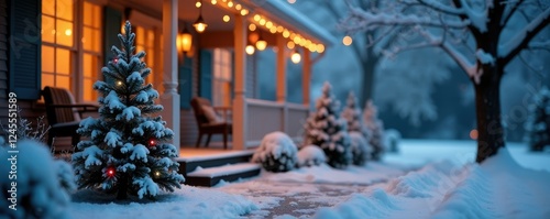 Miniature snow-covered trees on a front porch, winter, twinkle lights