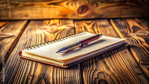Miniature Tilt-Shift Photo: Notebook and Pen on Rustic Wood Desk