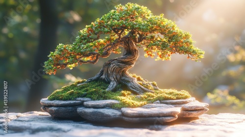 Miniature tree of life, meticulously crafted bonsai, bathed in sunlight