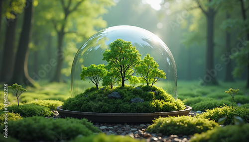 Miniature trees inside glass dome in lush green forest