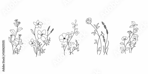 minimal botanical graphic sketch line art drawing, trendy tiny tattoo design, floral elements vector illustration