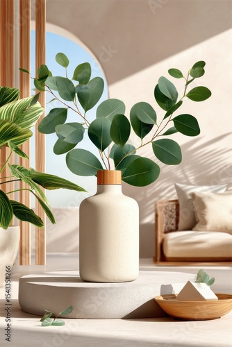 Minimal ceramic vase with fresh eucalyptus leaves in a calming decor setup