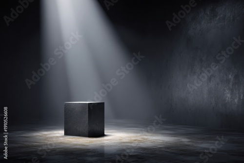 Minimal dark scene with concrete cube pedestal illuminated by spotlight, ideal for product display, branding presentation or modern mockup background.