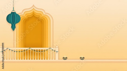 Minimal Diwali Paper-Cut Vector Banner, Golden Pastel Lanterns & Diyas