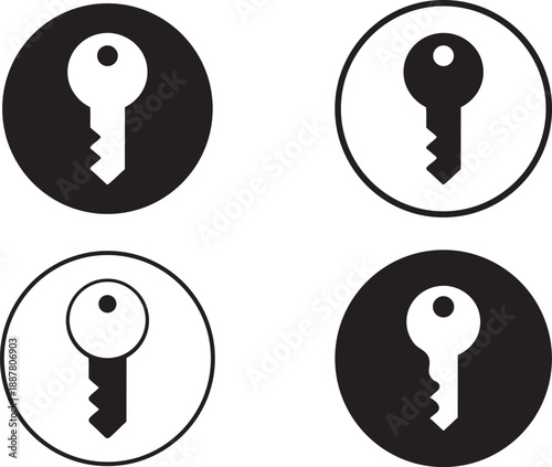 Minimal Key Icon Set in Black and White Circle Styles on White Background