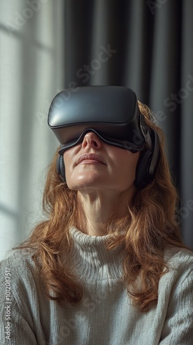Minimal portrait of mature female psychologist using VR technology in therapy session for army veterans struggling with PTSD, Generative AI