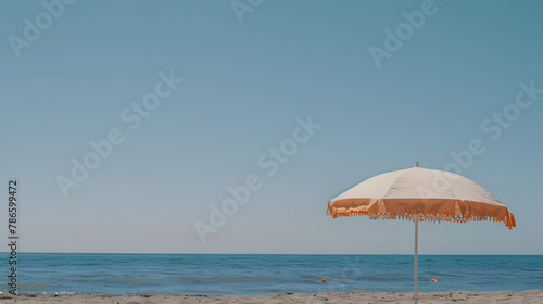 Minimal summer holidays vacation concept. Beach umbrella in front of blue sky and sea. Chilling, lounging on the beach