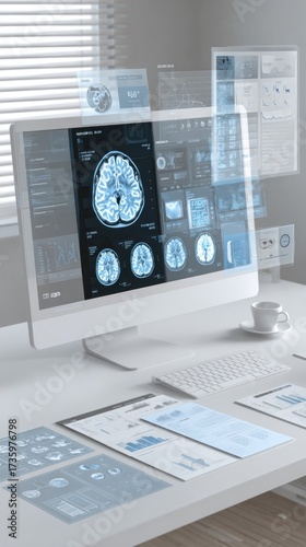 Minimal user interface medical background, MRI brain scans displayed on clean white computer screen, simplified diagnostic charts, subtle blue and gray overlays, flat design style, uncluttered.