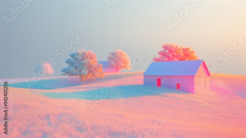 Minimalist 3D landscape of a rolling countryside with brightly colored barns and fields.