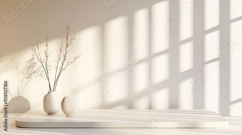 Minimalist 3D stage with neutral tones and soft reflections, modern platform, elegant simplicity