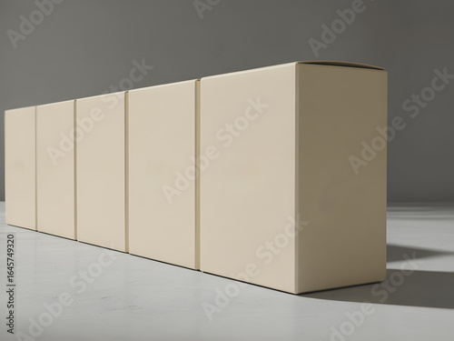 Minimalist arrangement of cream boxes lined up in a studio setting during daylight