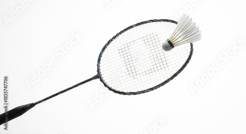 Minimalist badminton still life presenting racket and shuttlecock on white background representing