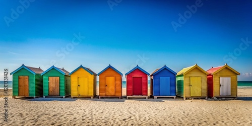 Minimalist Beach Huts on Sandy Shore, Summer Vacation Coastal Scene