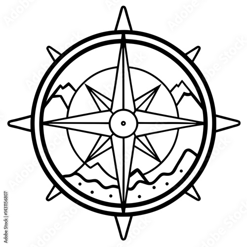 Minimalist Black Line Art Compass Rose Vector Icon with Mountains and Waves Isolated