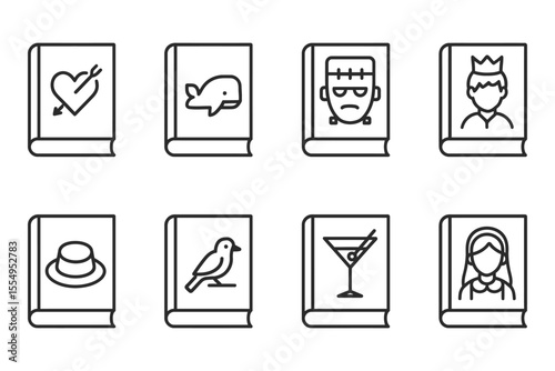 Minimalist book icon set: romance, adventure, fiction, and more, vector illustration