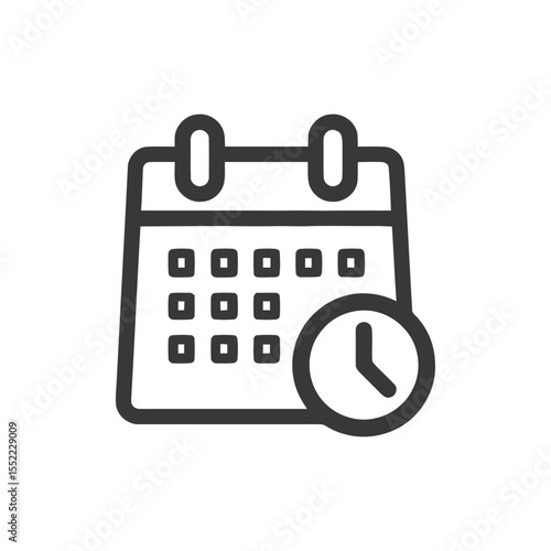 Minimalist Calendar Icon with Clock, Black Outline on White Background