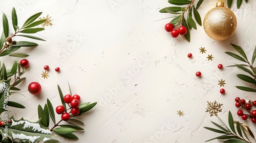 Minimalist Christmas Background with Golden Bauble, Red Berries, and Pine Leaves on White Space