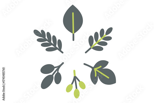 Minimalist collection of natural foliage shapes including different leaves and small berries arranged circularly
