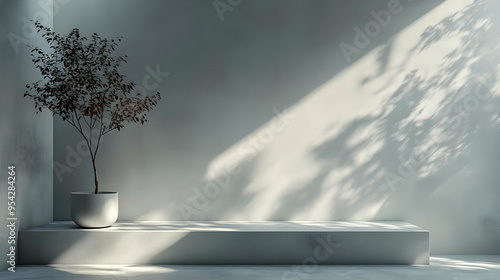 Minimalist Concrete Platform with Plant and Sunlight Shadows