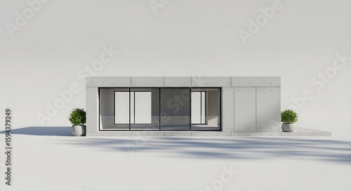 Minimalist Concrete Structure with Glass Windows, Greenery, and Shadows.