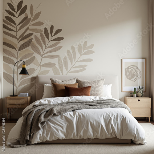 Minimalist Cozy Bedroom with Neutral Tones and Elegant Botanical Wall Art