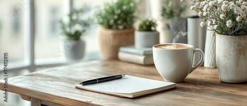 Minimalist desk setup with a notebook and pen, topdown view, soft natural tones