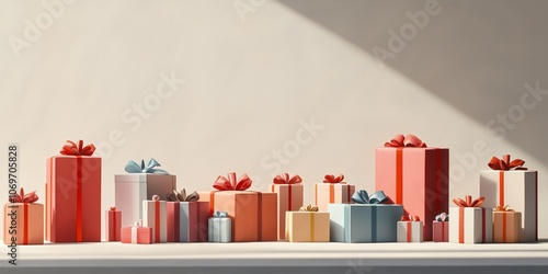 Minimalist display of gift boxes in various colors under sunlight