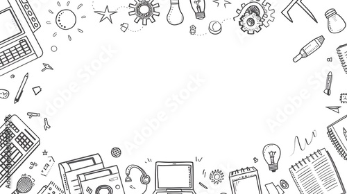 Minimalist Doodle Border Design with Office Supplies and Creativity Symbols for Mockup or Background