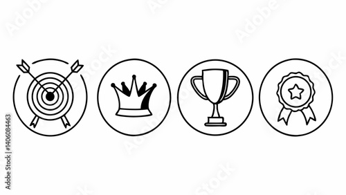 "Minimalist editable stroke vector icons featuring achievement elements: goal targets, success paths, winner podiums, and motivational milestones — ideal for personal growth or business apps."